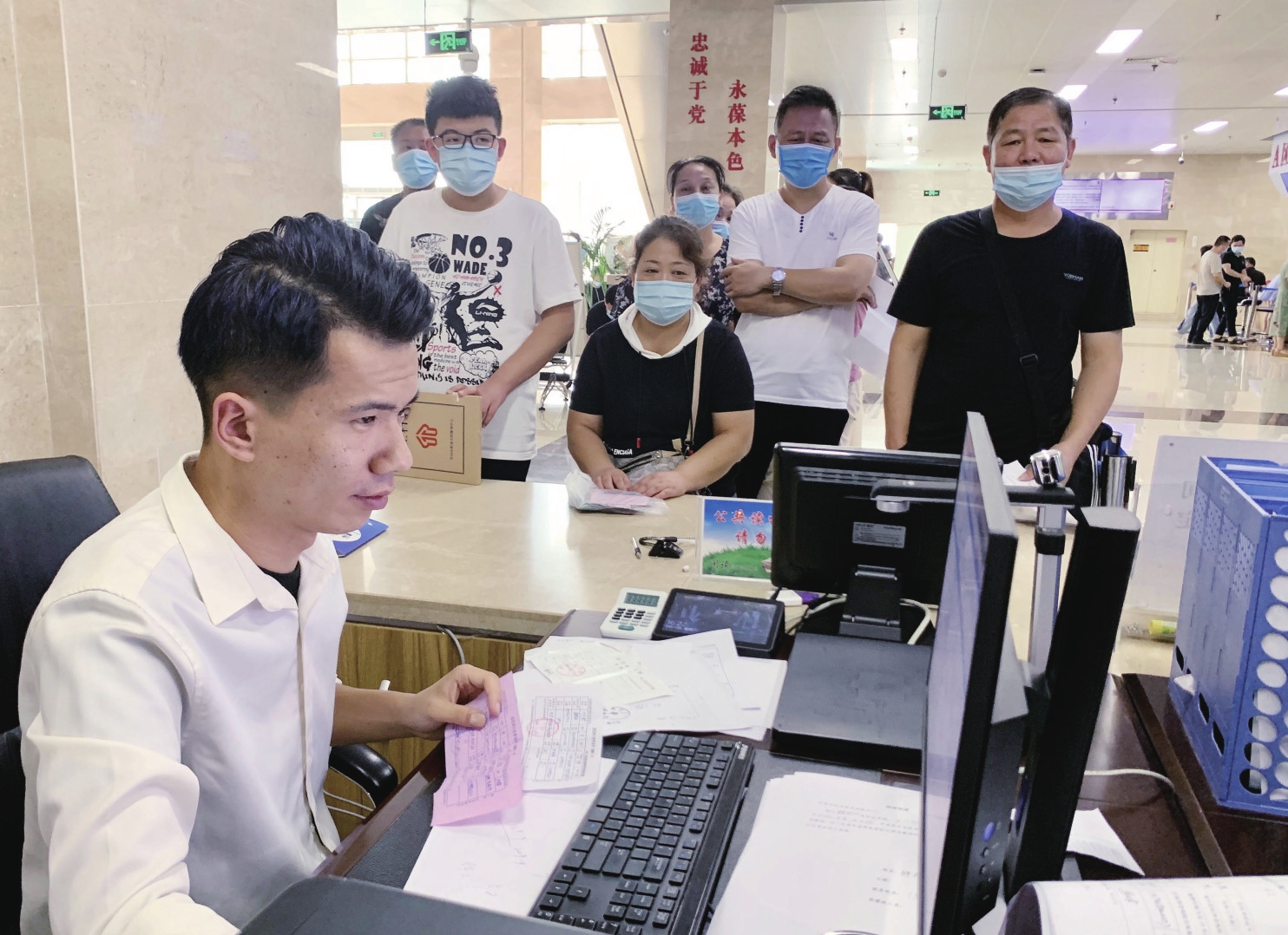8月25日,在许昌市民之家社会保险综合受理窗口,工作人员正在认真为市民办理相关业务。据了解,因每月中下旬都是业务办理高峰,市民排队等候时间较长,较为不便。工作人员提醒,月底各项业务进入推送审核阶段,所以窗口当月26日暂停办理,到次月初恢复,希望市民采取错峰办理、网上办理、使用社保一体机辅助办理等方式,提高办理效率。 本报记者 史晶 摄