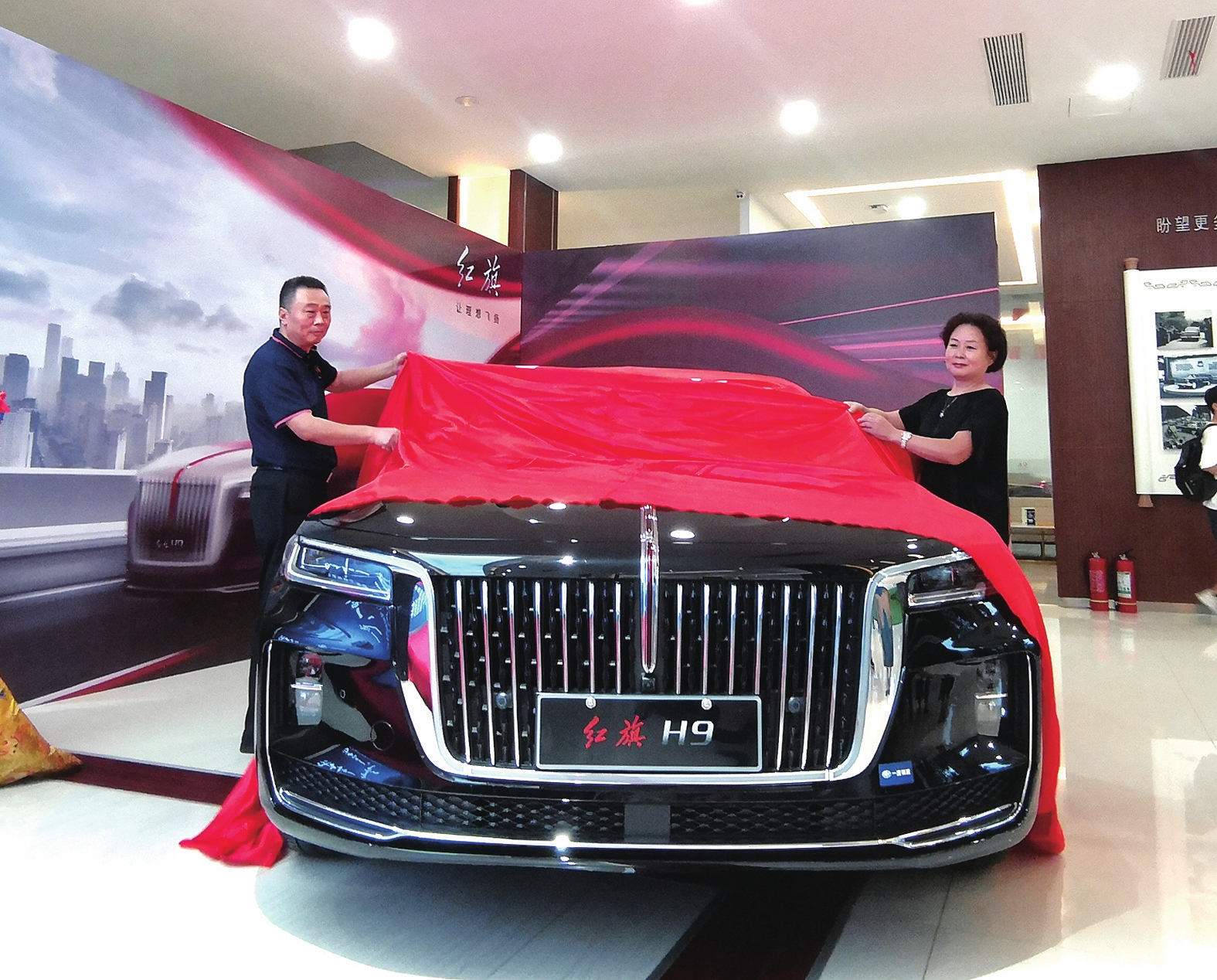 何昕说:“对于中国人而言,红旗不仅是一个著名的汽车品牌,还是一种深深的情怀和神圣的记忆。对于‘一汽人’而言,红旗更是一种强烈的责任和历史的使命。1958年,红旗牌轿车诞生,红旗轿车成为中国汽车工业的一面旗帜。2018年1月8日,中国一汽实施新红旗品牌战略,开启了新时代红旗振兴的宏伟篇章。在新战略的指引下,红旗首次独立参加北京车展、红旗H5/HS5震撼上市、60周年系列庆典活动、参与世界互联网大会、首次参加CES大展、与故宫进行战略合作等一系列举动,在品牌塑造、造型设计、产品矩阵、技术研发、品质质量、渠道服务、销售业绩、创新生态等各个维度取得了不凡的成绩。随着红旗H7、H5、HS5、HS7相继亮相,社会反响强烈。今天,我们将在这里目睹实施新红旗品牌战略后的首款豪华C+级豪华旗舰轿车红旗H9。红旗H9的上市将为我们带来新时代、新红旗、新梦想、新征程的红旗轿车新体验!”随后许昌恒旭红旗体验中心总经理王德民和特邀嘉宾为新车揭幕。