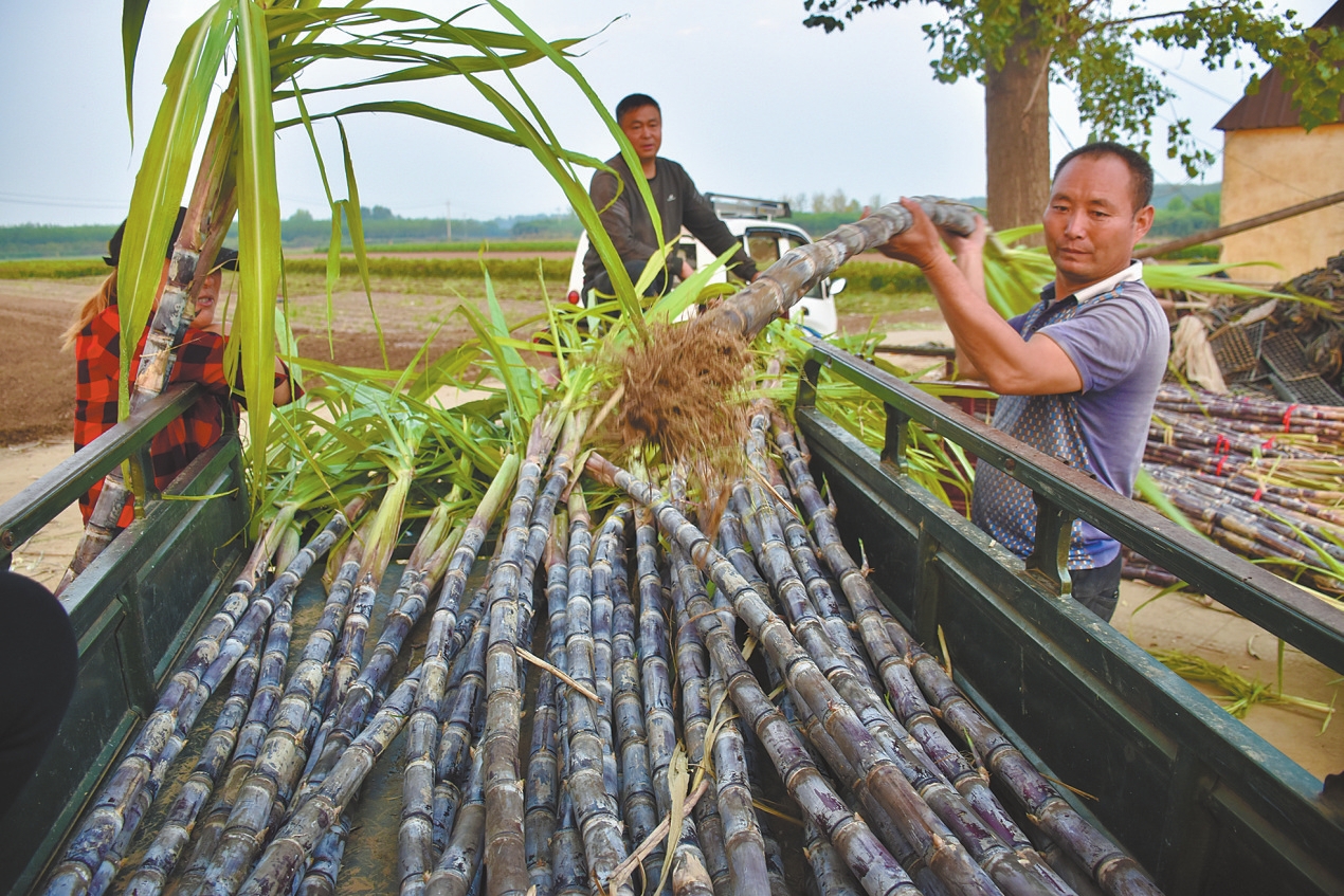 10月13日,襄城县颍阳镇纪拐村村民焦晓辉(右)正在把收获的甘蔗装车,供应市场。据了解,在当地政府的扶持下,焦晓辉流转土地80余亩,引种水果、甘蔗等高效益的经济作物,还广泛吸纳周边季节性闲散劳动力务工,带动乡亲们共同致富。 本报记者 史晶 通讯员 邓军 摄