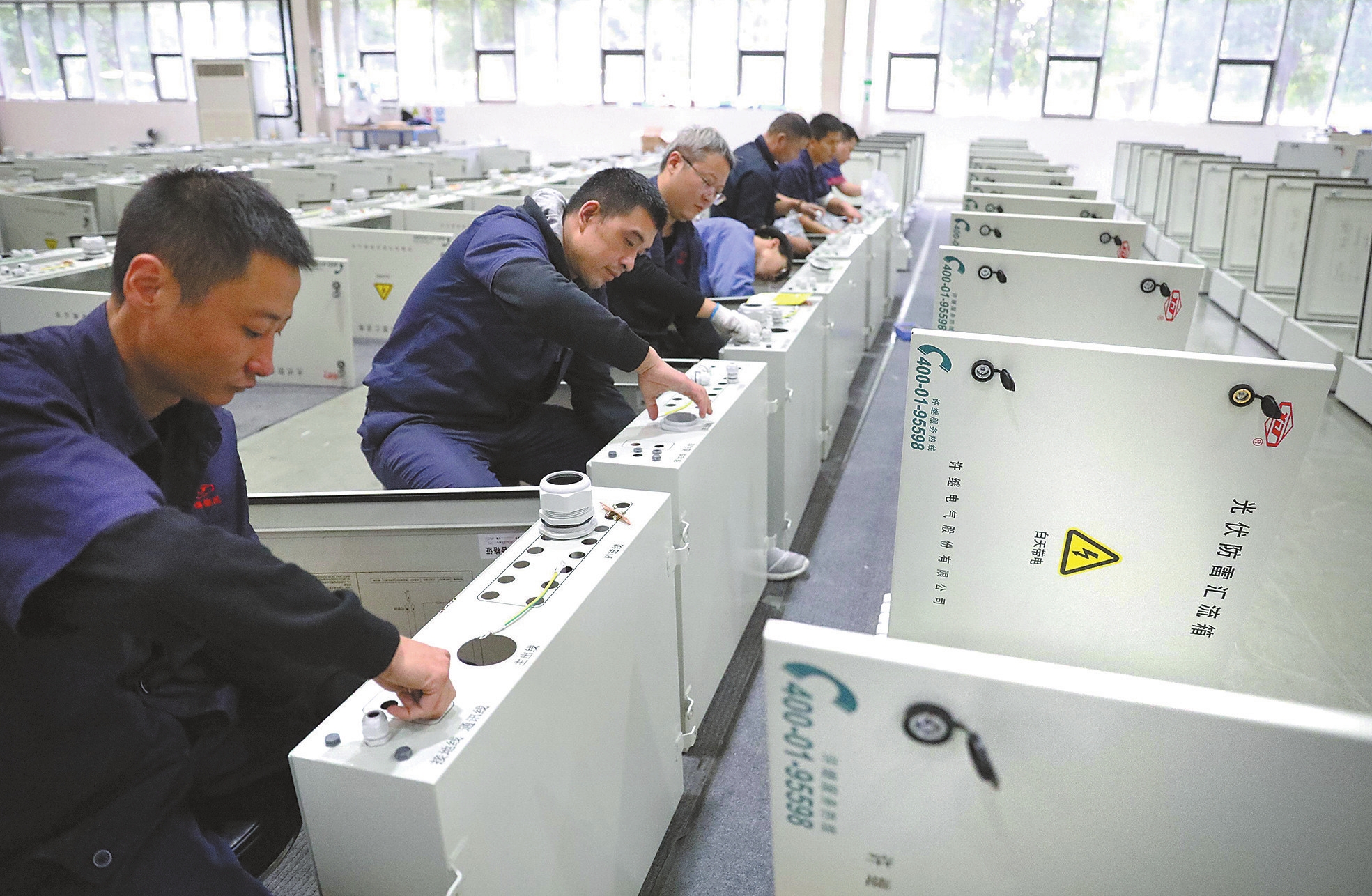 10月12日,许继电气股份有限公司员工正在加紧装配光伏防雷汇流箱订单产品。今年以来,该公司通过打造“零浪费”生产现场,提升汇流箱产品生产作业效能,销售业绩实现稳步增长。 本报记者 乔利峰 摄