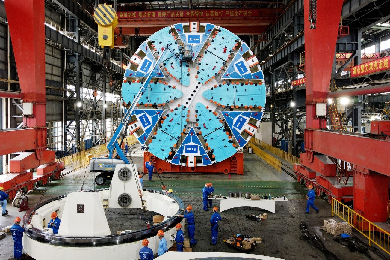 10月15日,在隧道股份上海隧道工程有限公司机械制造分公司生产车间,工人在对“骐跃”盾构机进行安装调试(无人机照片)。近日,由隧道股份上海隧道工程有限公司自主研发制造的超大直径盾构机“骐跃”在上海浦东成功调试下线。“骐跃”整机总重约为3200吨,总长约为99米,其中主机长度约为16米,刀盘切削直径达14.05米。 新华社记者 方喆 摄