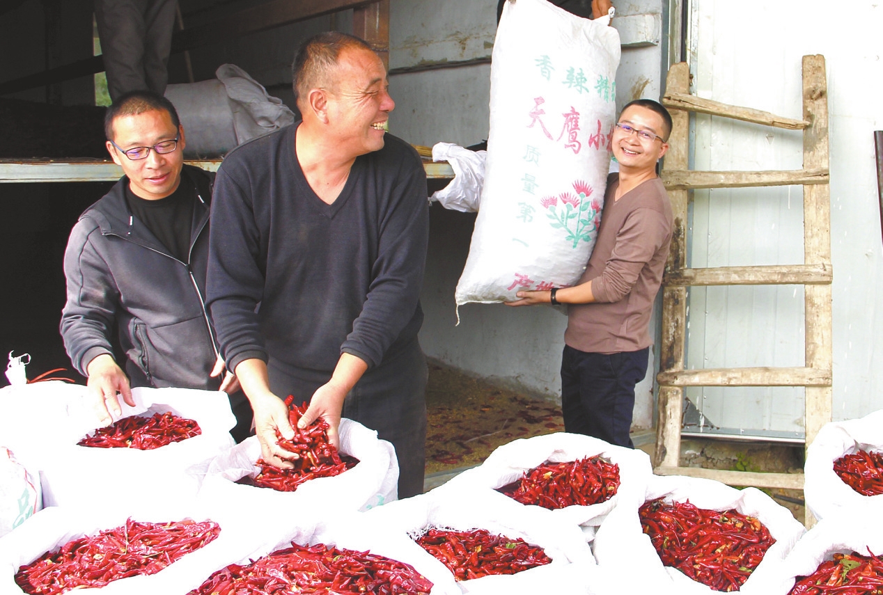 10月26日,襄城县麦岭镇新乔庄村农民刘学卿(中)一家正在打包准备销售的朝天椒。近年来,麦岭镇党委、政府通过党建引领,积极引导鼓励农民调整种植结构。目前,该镇朝天椒种植面积达1.2万亩,亩产值6000多元,成为当地农民致富的支柱产业。 本报记者 史晶 通讯员 方晓鹏 摄