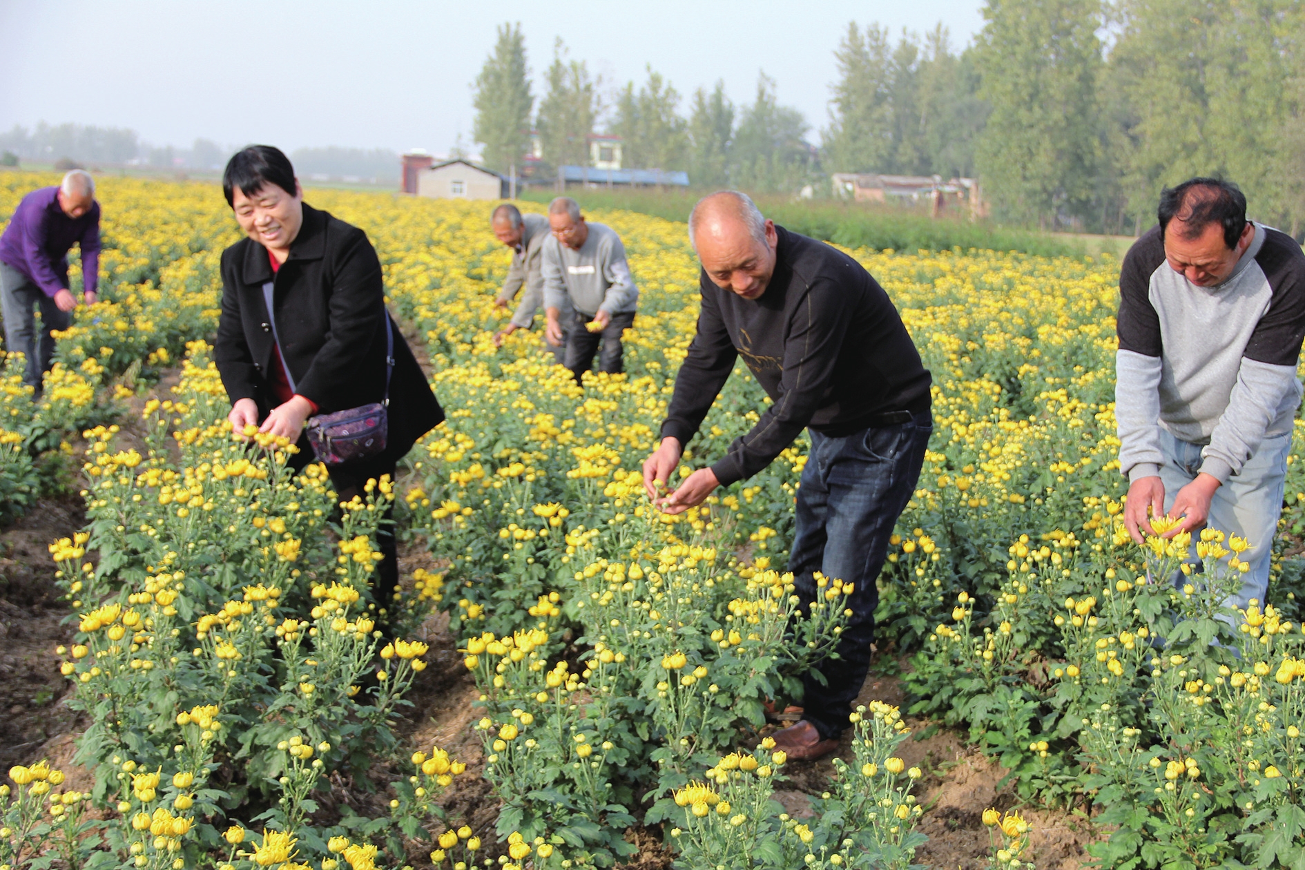 近年来,襄城县范湖乡党委、乡政府实行党建引领脱贫攻坚,采取“公司十合作社十贫困户”的发展模式,通过种植金丝菊、黄蜀葵等特色农产品,有效带动贫困群众增收致富。图为10月23日,该乡农民在金丝菊种植基地采摘菊花。 本报记者 史晶 通讯员 古国凡 摄