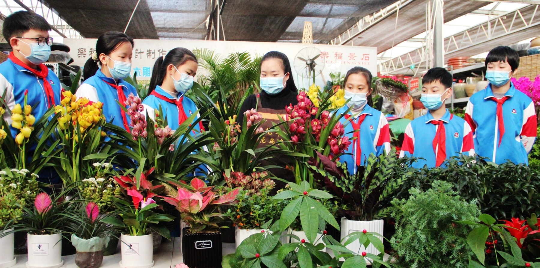 2月6日,许昌实验小学铁西校区六(2)中队的学生到市区某市场开展寒假社会实践活动。通过聆听讲解与实物观察,学生们对花卉的生长习性有了全面的认识。图为绿植店主在为学生们讲解鲜花与盆景的养护知识。 吕正子 摄