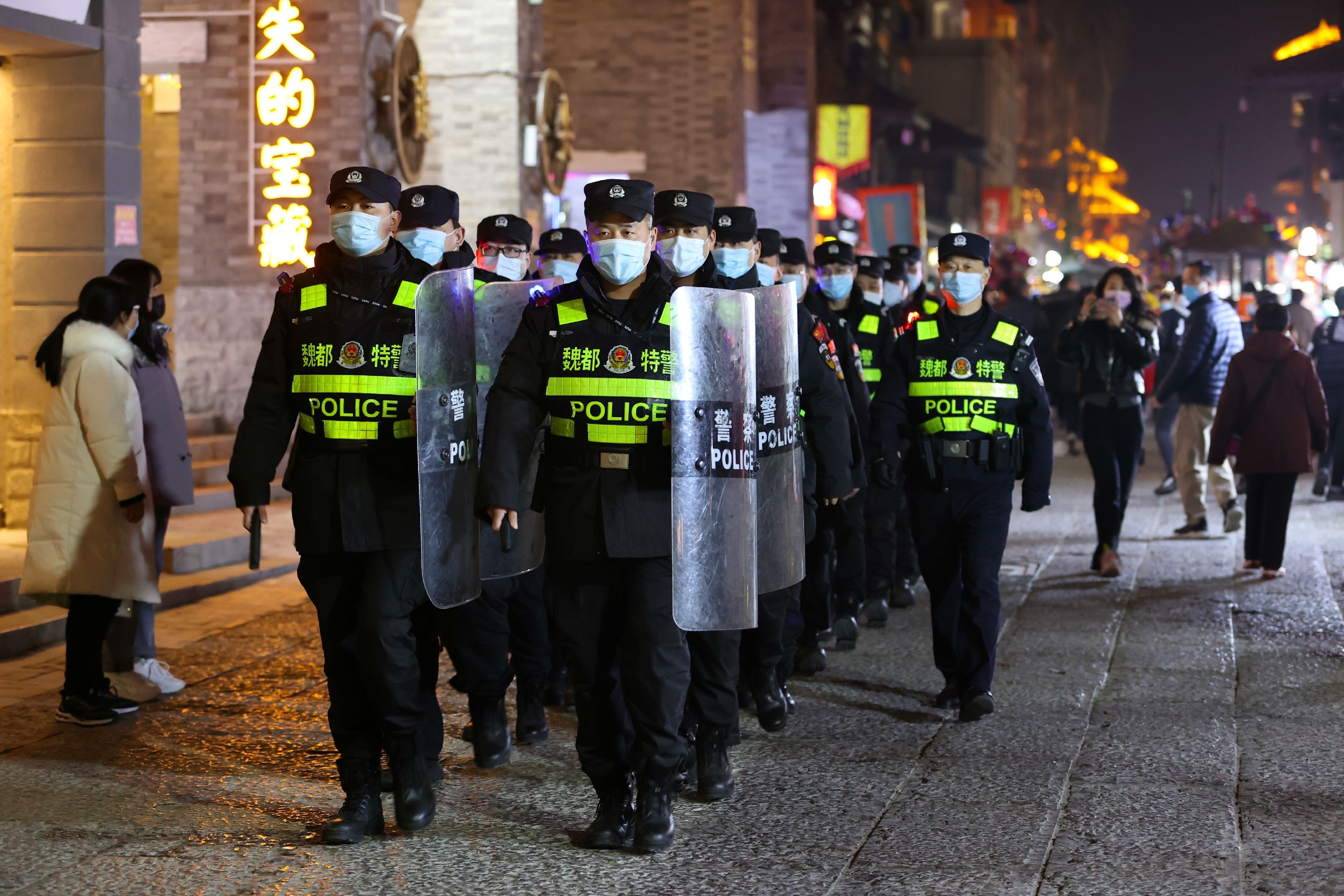 2月15日晚,民警在曹魏古城巡逻。“春节不打烊”“过年不掉线”,春节期间,许昌市公安局魏都分局组织民警在曹魏古城、曹丞相府等商圈不间断巡逻,确保节日安全,因为他们的坚守,这个特殊的春节格外可贵。 本报记者 牛书培 摄