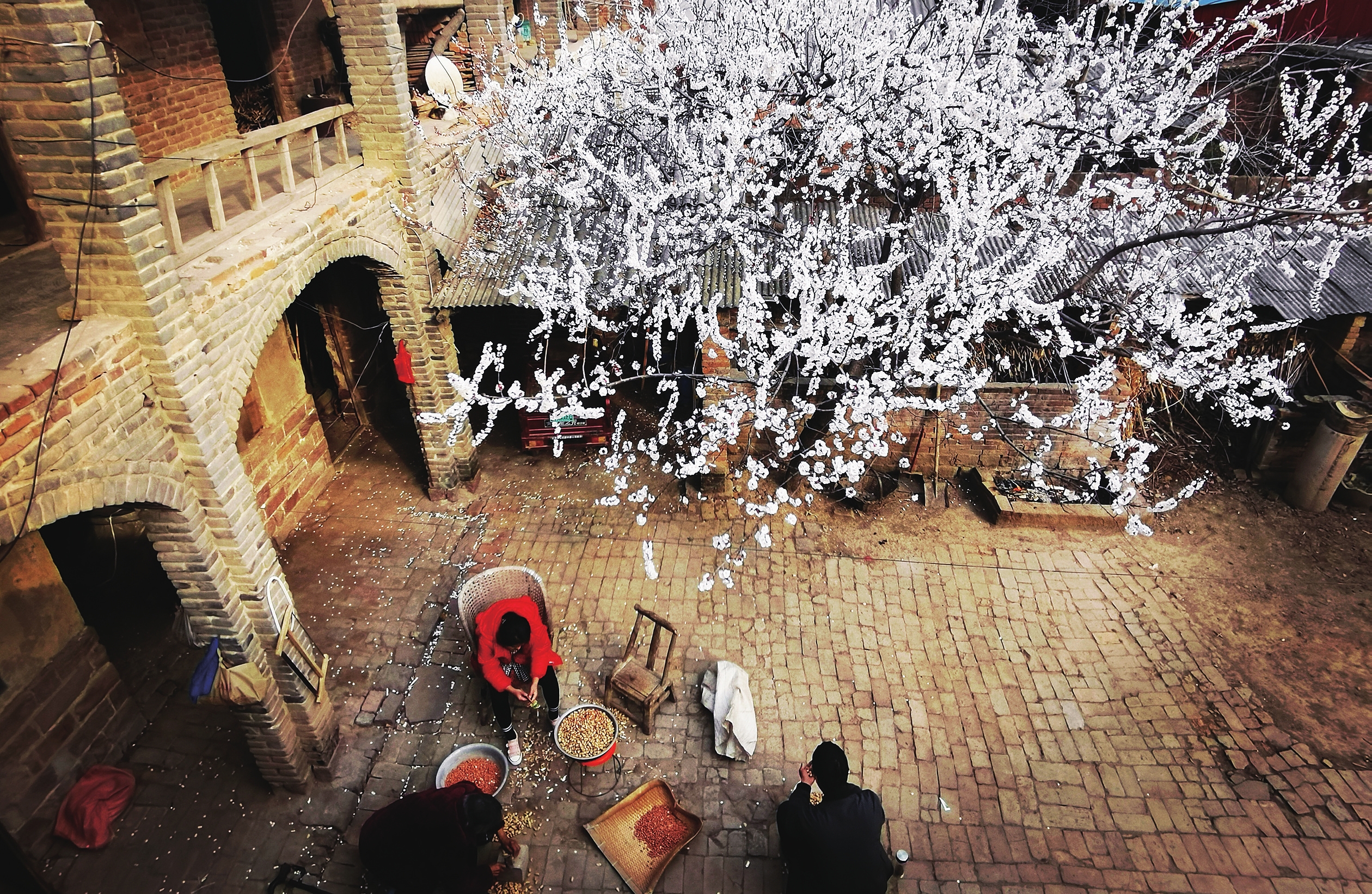 杏花树下话幸福 朱宁 摄