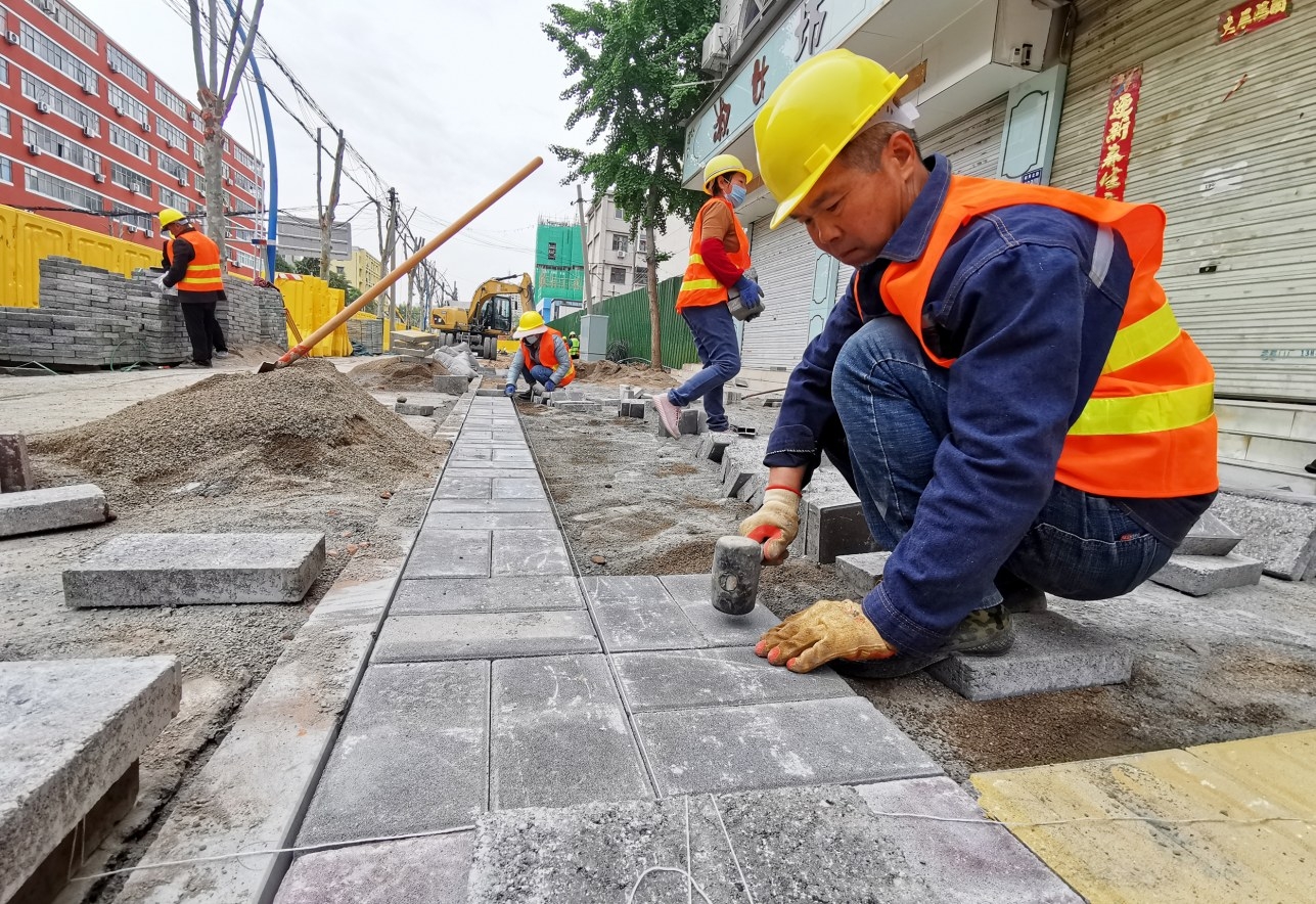 4月28日,市区毓秀路综合整治提升改造工程现场,工人正在进行地砖铺设。该工程全长1380米,北起莲城大道、南至许扶运河桥,将开展行车道改造、慢车道改造、人行道改造、热力管网铺设、给排水井盖更换等项目建设,完工后将极大改善毓秀路形象,提升沿线群众幸福感和满意度。 本报记者 乔利峰 摄