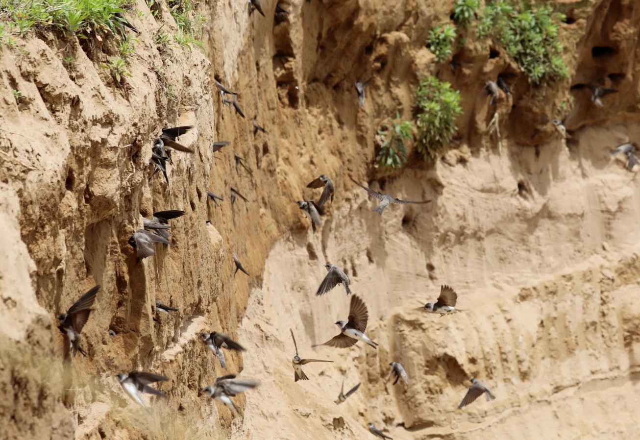 5月7日,建安区榆林乡刘王寨村崖沙燕的栖息地异常热闹。崖沙燕,又名灰沙燕,喜欢成群结队在水源附近的沙土崖壁上筑巢,它是捕食蚊蝇等小飞虫的益鸟,是我国有益、有重要经济价值、有科研价值的“三有”保护动物。 本报记者 乔利峰 摄