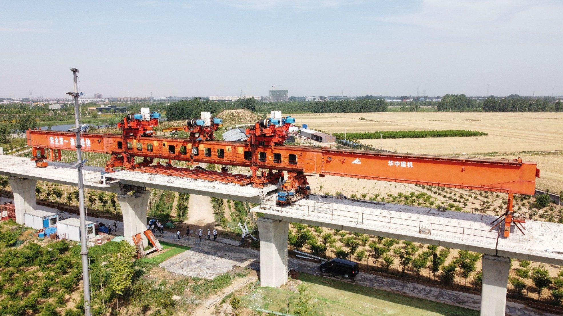 6月7日上午,在长葛市大周镇郑许市域铁路许昌段项目施工现场,随着最后一孔节段梁在架桥机的吊装下精确落位,郑许市域铁路许昌段高架区间全线贯通。