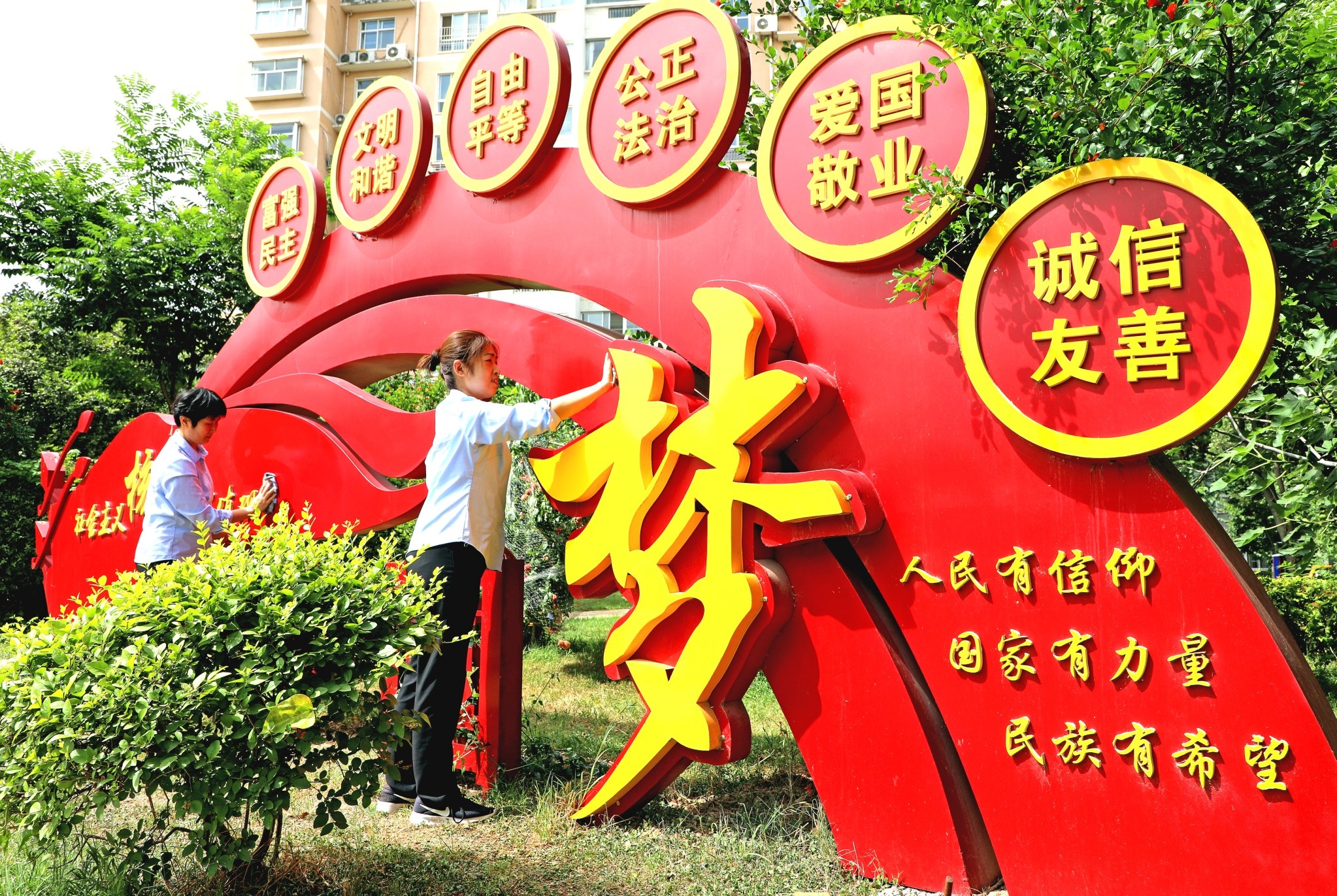 6月3日,东城区天宝路街道办事处祥瑞小区的物业人员在小区内擦拭社会主义核心价值观标牌。近年来,我市始终坚持把满足人民日益增长的美好生活需要作为出发点和落脚点,擦亮城市文明底色,不断增强市民的获得感、幸福感,实现从“创建文明城市”到“建设城市文明”的一次次跨越,走出一条具有许昌特色的文明城市创建之路。 本报记者 谭宜姝 摄