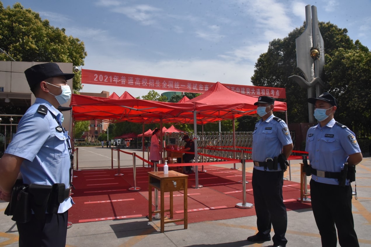 又是一年高考季,魏都公安分局执勤民警、辅警严阵以待,提前到达各考点及周边的执勤岗位,为高考保驾护航。图为6月7日,民警在许昌高中建安大道校区考点执勤。 许廷合 摄
