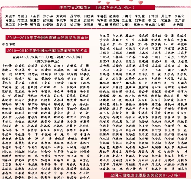 2021年6月14日是第18个“世界献血者日”。许昌市公民无偿献血委员会、许昌市中心血站谨代表千千万万个得到你们帮助的用血患者及家庭,向全市所有参与无偿献血的爱心人士致以崇高的敬意和美好的祝愿,向长期以来关心、支持、参与无偿献血的各级机关、企事业单位、社会团体及爱心人士表示衷心的感谢!感谢你们用爱心和热血,托起生命的希望。
