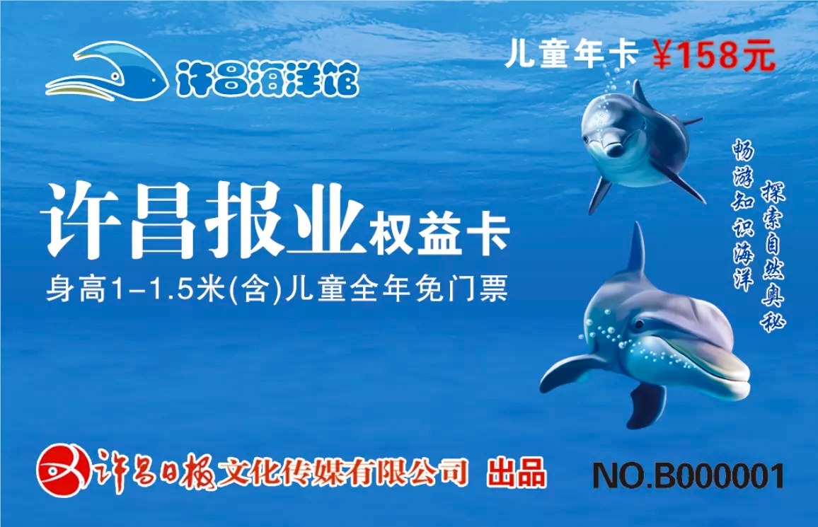 自6月28日起,为满足许昌市民,特别是青少年儿童渴望走近海洋、了解海洋的需求,许昌日报文化传媒有限公司联合许昌海洋馆推出了许昌报业权益卡·许昌海洋馆儿童年卡,专为身高1—1.5米(含)的儿童定制,每张只需158元。如果孩子是许昌晨报小记者,还能立省30元,每张仅需128元。拥有该卡后,凭本人小记者证(当年认证)即可不限次数、不限身高“畅游”许昌海洋馆。