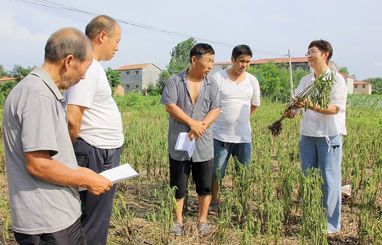 7月28日,鄢陵县农业农村局高级农艺师蔡庆霞(右一)在鄢陵县望田镇逊耕村给群众讲解灾后如何进行田间管理。为迅速恢复生产,降低农民损失,许昌市组织农业技术人员深入田间地头,根据不同作物、不同地块、不同受灾程度等情况,进行分类指导、具体帮扶。 签约摄影师 韩志燕 摄