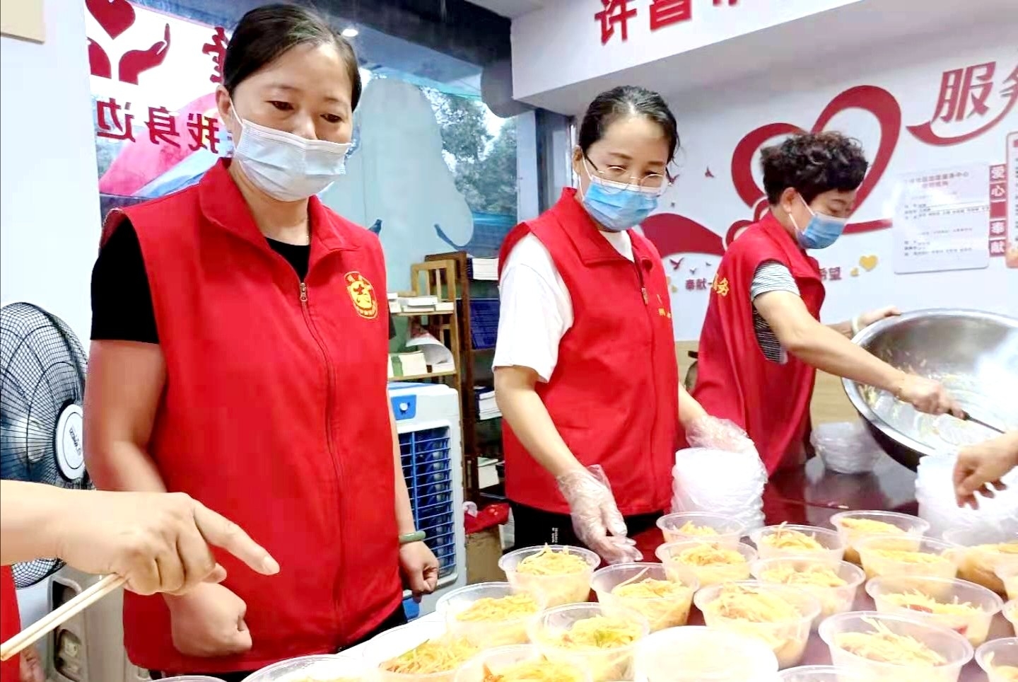 8月17日,市区文峰社区爱心粥屋的志愿者在准备午餐。连日来,文峰社区爱心粥屋每天保障7个社区和单位的300余防控一线人员的一日三餐。 黄增瑞 摄
