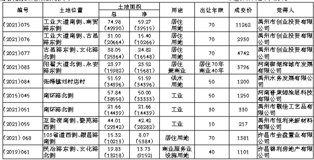 经禹州市人民政府批准,禹州市自然资源和规划局于2021年8月13日举办了11宗国有建设用地使用权公开拍卖出让活动,成交10宗,结果如下: 单位:(㎡)、亩、年、万元