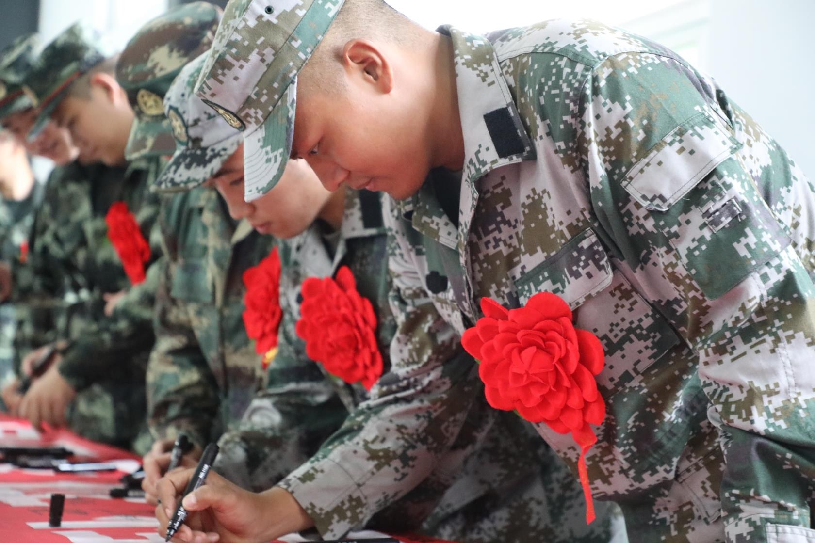 9月18日,魏都区举办2021年下半年新兵入伍欢送大会,200余名新兵启程奔赴军营。图为在欢送大会上,新兵们在“迈向强国新征程,军民共筑强军梦”主题横幅上签名。 许廷合 摄