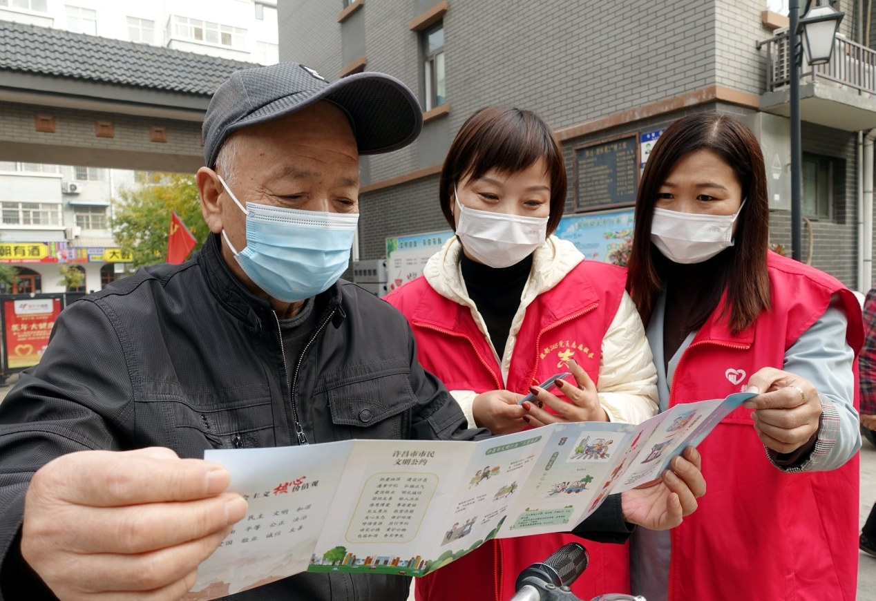 11月12日,在市区文化街清林苑小区,社区工作人员向市民宣传创文工作。为进一步提高居民对创文的知晓率和参与度,倡导大家以主人翁的姿态参与到创建文明城市中来,魏都区西大街道办事处魏武社区工作人员深入辖区小区、庭院等场所,开展创建文明城市宣传活动。 黄增瑞 摄