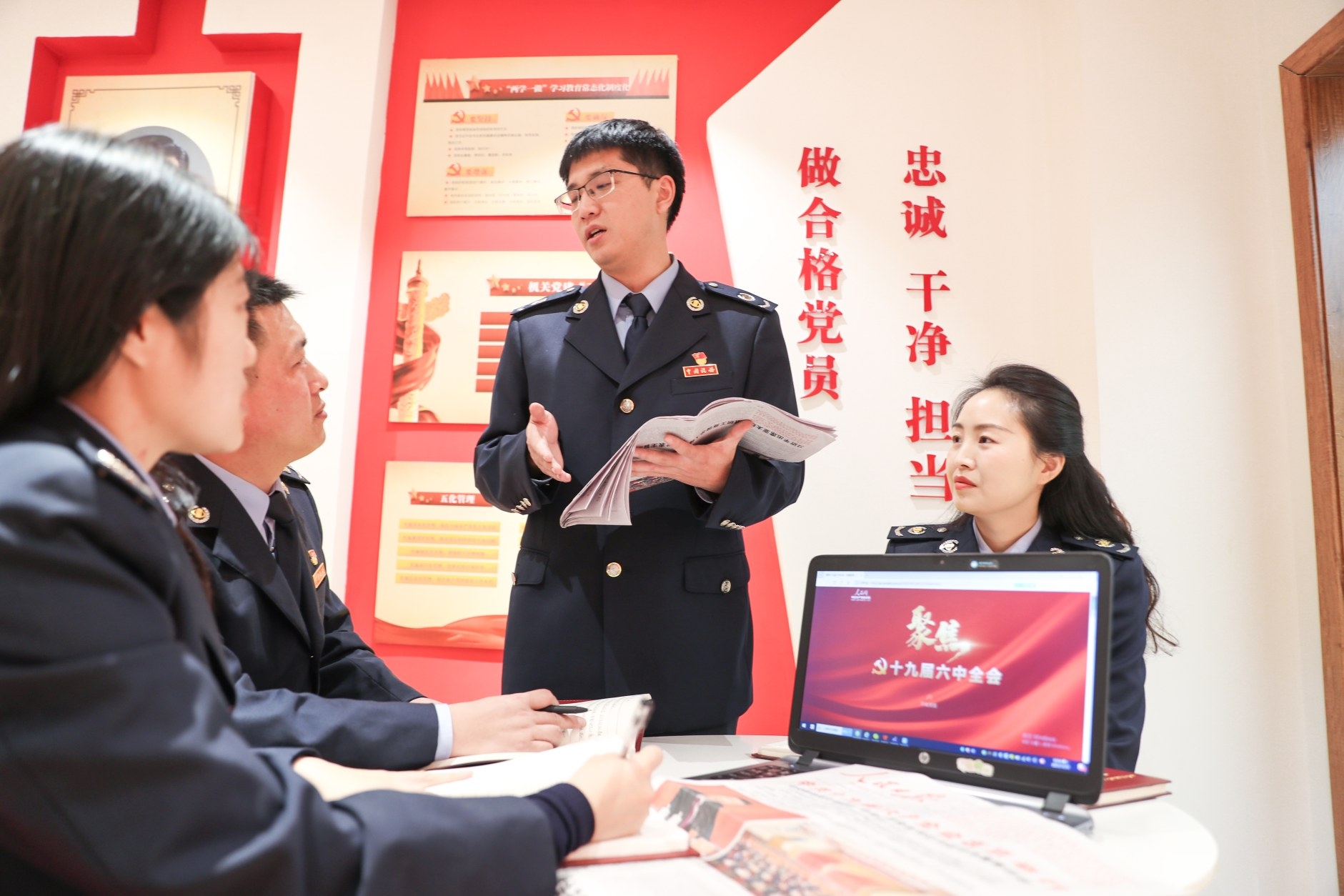学思悟践守初心,凝心聚力向前进。连日来,全市税务系统以组织收听收看新闻报道、召开专题会议学习全会公报、结合工作实际研究贯彻落实举措等形式,扎实开展党的十九届六中全会精神传达和学习。图为税务系统青年党员结合岗位实际,交流分享学习全会精神体会。 李建亚 摄