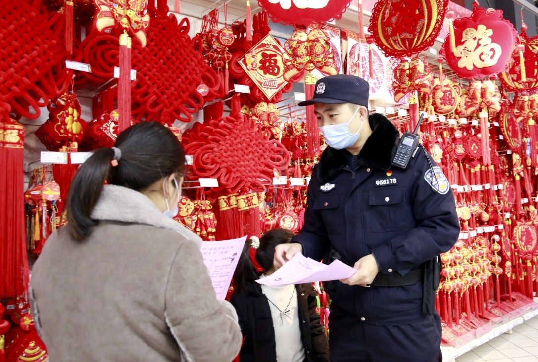 2月4日,许昌市公安局东城分局天宝路派出所民警走进沿街门店进行禁燃禁放宣传,引导商户文明过节。 骆大群 摄