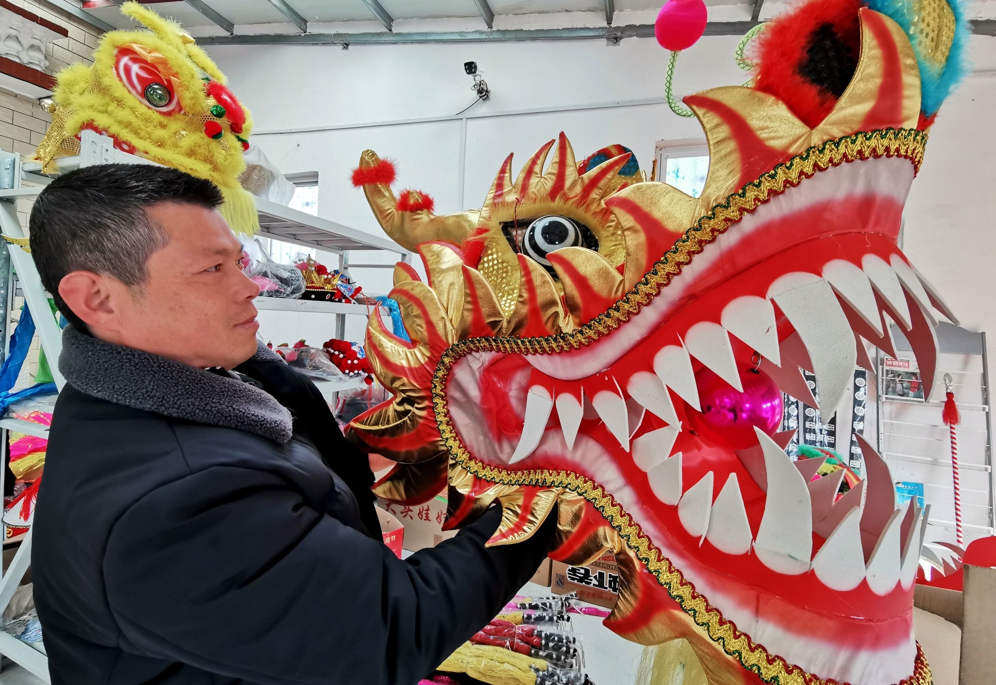 2月8日,在建安区灵井镇霍庄村,来自鄢陵县的客户正在选购舞龙道具。目前,灵井镇霍庄村的社火道具进入销售旺季,喜庆的舞龙、舞狮、毛驴、旱船等社火道具吸引周边不少乡镇表演团体前来选购。 本报记者 乔利峰 摄