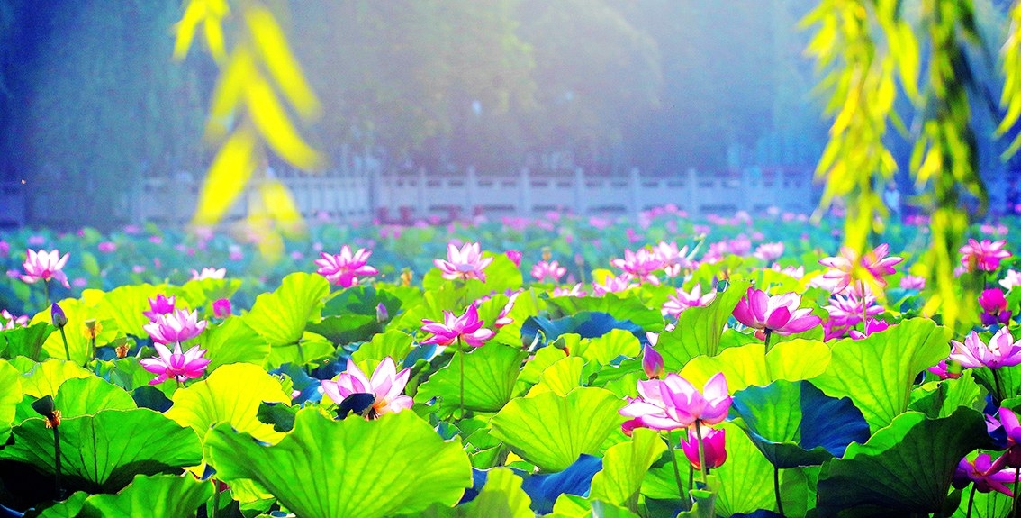 盛夏时节,护城河内莲叶田田、荷花争艳,岸边垂柳依依、绿意盎然,形成了“满城荷花半城柳”的美景。图为6月26日,护城河莲花湾一隅。 签约摄影师 高文胜 摄