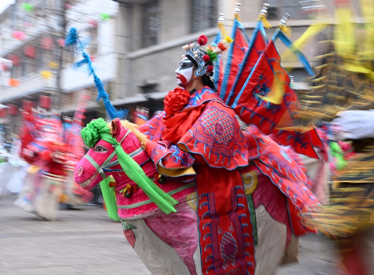 2月6日,社火团队的演员在庙会上表演。 当日是农历正月十六,在河南省浚县举行的正月古庙会上,几十支社火团队轮番表演,踩高跷、扭秧歌、耍狮子,锣鼓喧天,热闹非凡,形成一道富有特色的中原文化景观。河南省浚县的正月古庙会已有1600多年历史,有“华北第一庙会”之称,被誉为民俗文化的“活化石”,是中国民间文化保护工程项目、国家级非物质文化遗产。 新华社记者 宋彦桦 摄
