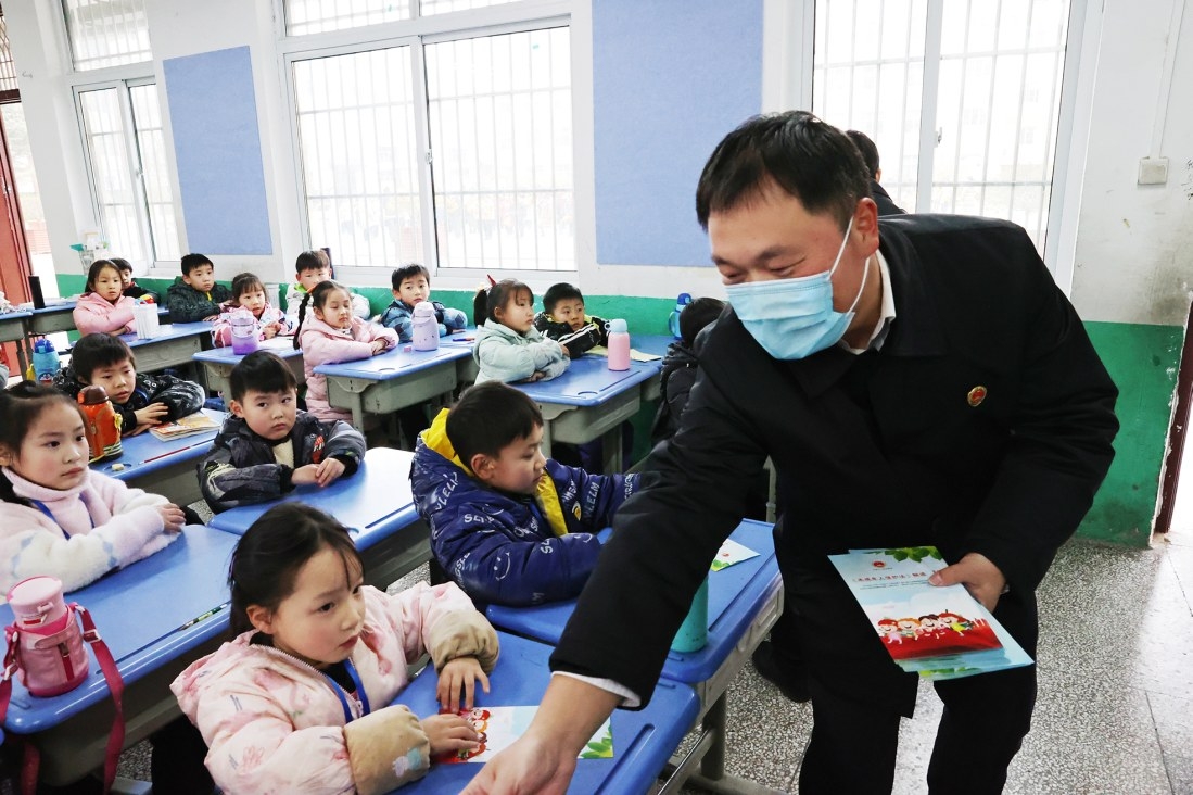 2月10日,在鄢陵县人民路小学,鄢陵县人民检察院检察官向同学们发放宣传彩页,引导同学们争当知法、守法的好少年。 梁庆尧 摄