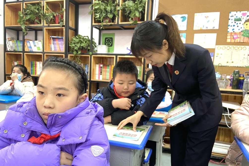 2月10日,建安区人民检察院检察官走进建安区实验小学,和孩子们一起看法治教育视频,向孩子们发放法律知识宣传页。王堃奇 摄