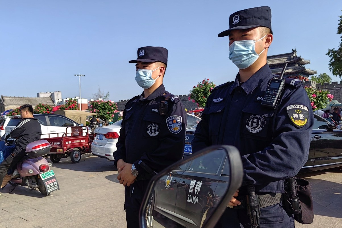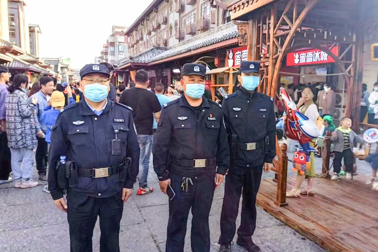 5月1日,许昌市公安局魏都分局民警在曹魏古城内值守,保证来许游客平安开心游玩。 曹秀军 摄